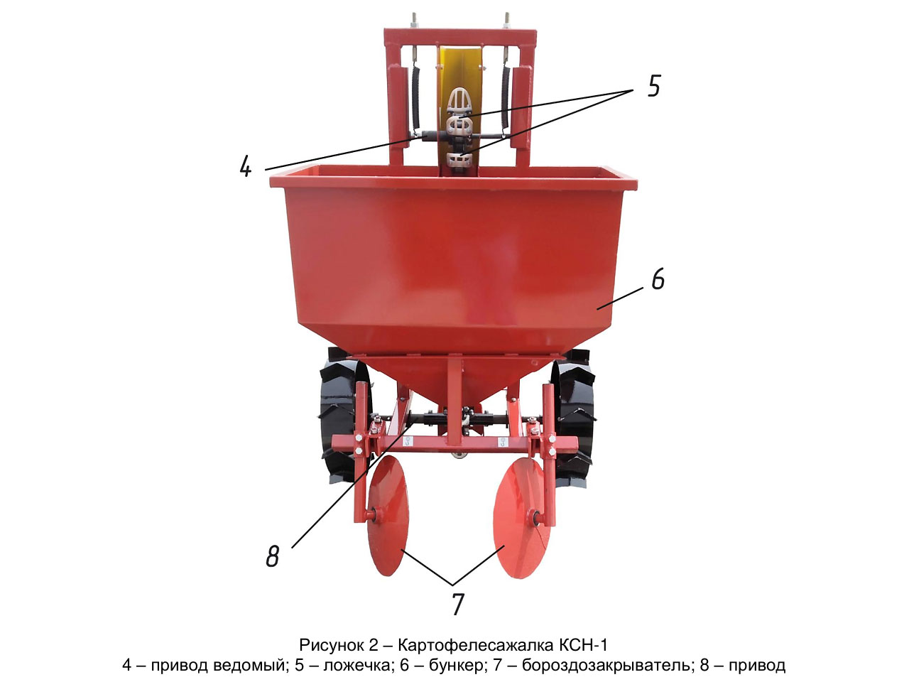 Агрегатируется с минитракторами типа Беларус-132Н, трактором малогабаритным Беларус-152 посредством рамы, на которой установлен сошник для формирования борозд. Привод приводит в действие транспортер с ложечками для захвата картофеля из бункера и укладывания в борозду. Закрытие борозд с высаженными клубнями картофеля производится при помощи бороздозакрывателей. Привод ведомый служит для приведения во вращение цепи транспортера. Кожух защищает транспортер с ложечками, двигающийся вне бункера.